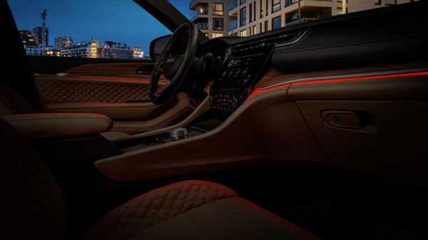 环境照明现已成为几乎所有主机厂的标配,Jeep 也不例外。 然而,它内饰装饰部分的设计脱颖而出,例如门板上的“双菱形”针脚图案……