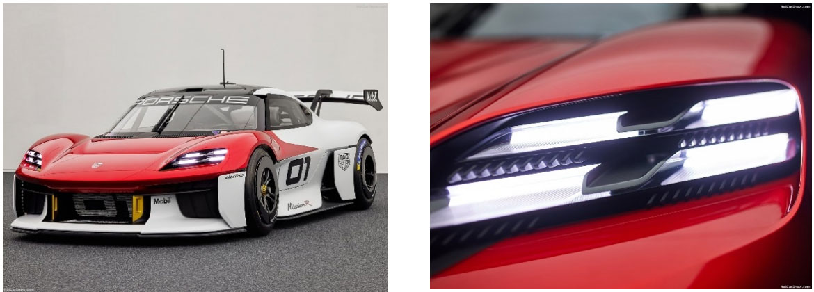 扁平的LED大灯极为显眼。四点式前灯源于Taycan电动跑车的大灯设计。