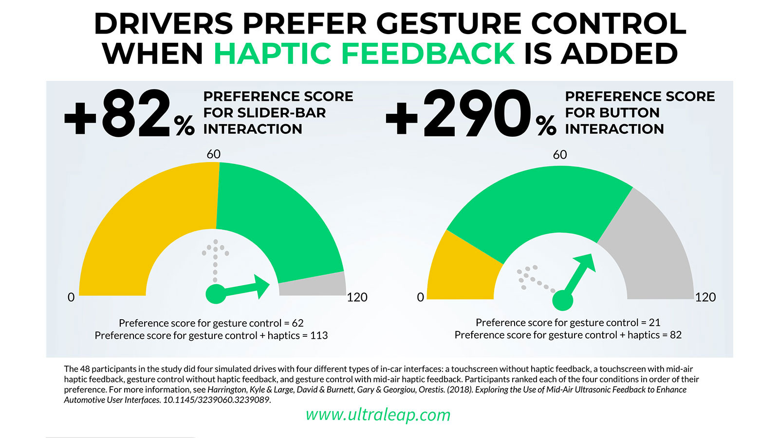 Ultraleap 和诺丁汉大学的一项合作研究表明, 11项空中触觉反馈用于汽车用户界面可降低出错率、“眼睛离开道路”时间和心理负担。 部分交互类型深受用户喜爱。