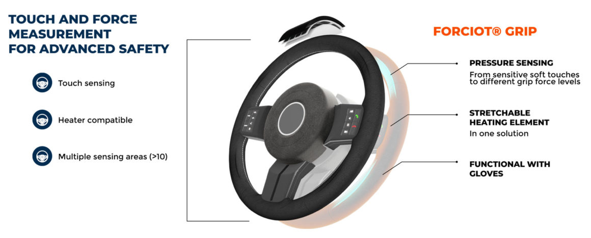 Forciot®可拉伸电子解决方案可以集成到方向盘中,以检测驾驶员手是否握盘以及手的握盘位置。