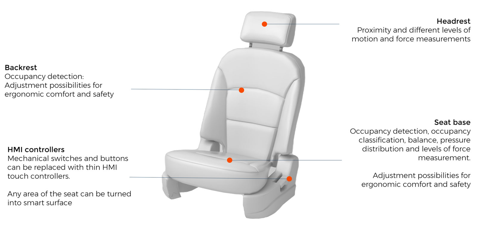 此外,座椅侧面或软座垫的HMI控件可替代所有机械开关和按钮功能。FORCIOT®HMI控制面板可以在汽车内饰的任何地方替换机械按钮,开关和滑块:门,座椅,控制台,装饰等,以增强UX并带来更多功能。
