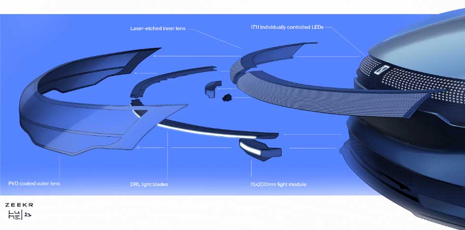 Jon:极氪与法雷奥合作开发了这项高科技创新。2 个数字面板包含 1700 多个独立控制的 LED,安装在柔性 PCB 上,以提供外观定制功能。在其外层,一个PVD镀膜的外透镜完全集成在汽车的前脸。