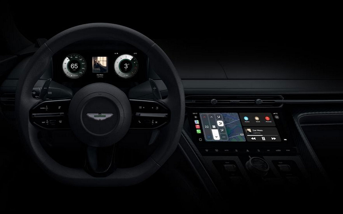 在阿斯顿·马丁的布局中,中央有一个媒体显示屏,周围环绕着车速表和转速表,并以品牌独特的绿色勾勒出轮廓。驾驶特定数据由汽车的传感器提供,即使 iPhone 运行应用程序也是如此。然而,苹果表示,这款手机不会存储或跟踪来自车辆的信息。