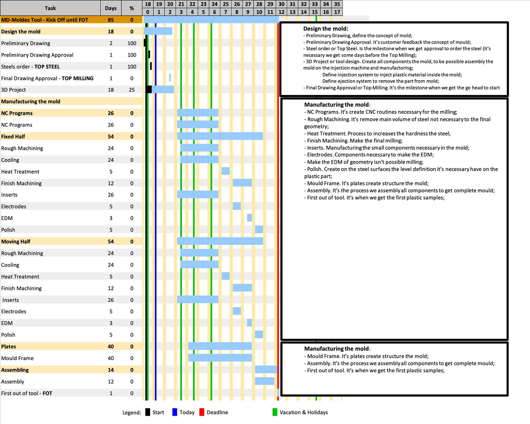 以下是一个MD模具示例,展示了从模具设计到塑料组件(12周 – 85天)的时间表。对于2K外部透镜和其他复杂模具,所需时间可能更长(18、20、22周),具体取决于尺寸,滑块数,腔孔等…