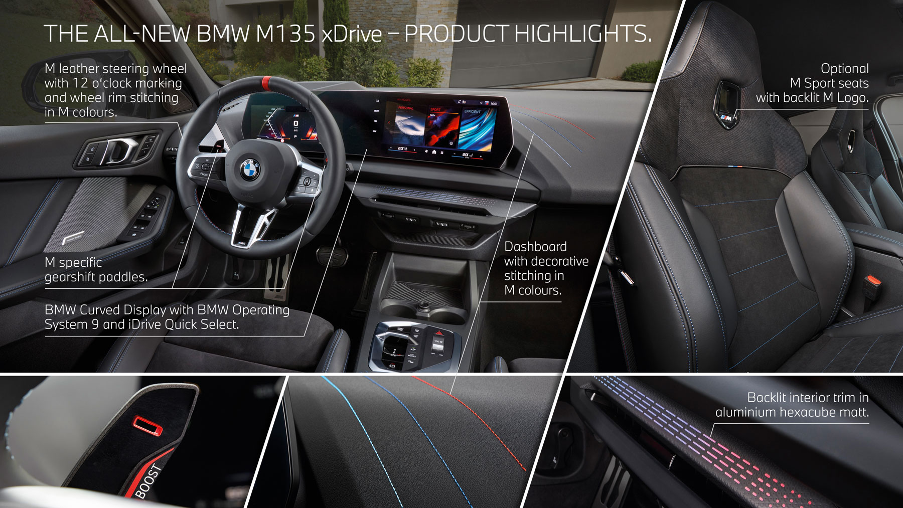 新款宝马 1系全新设计的内饰完全不含真皮,提供现代高级氛围,运动风格,宽敞空间最多可容纳5名乘客。全新设计的座椅为长途旅行提供了高度的舒适性。Econeer版本的运动型座椅,其盖子和内饰由再生聚酯纤维和M运动型座椅可选。Veganza 版本还提供穿孔座椅表面,具有类似皮革的特性。Veganza/Alcantara 设备是 M Sport 套件的一部分。