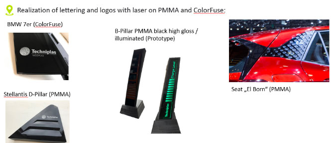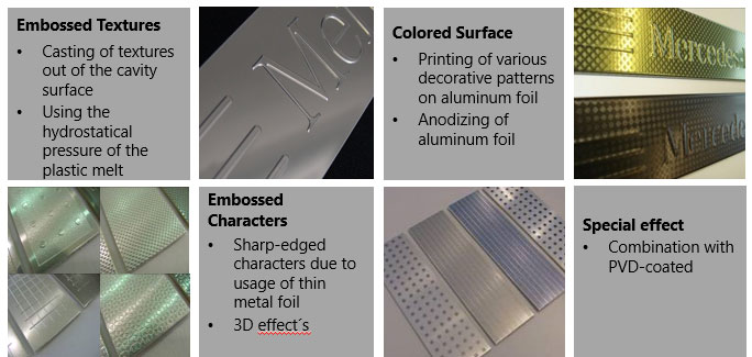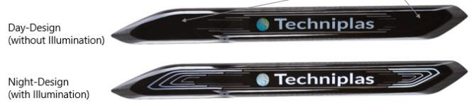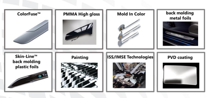在装饰表面领域,Techniplas-Weidplas使用ColorFuse、PMMA高光泽度、彩色模具、背模金属箔、皮线背成型塑料箔、喷漆、ISS/IMSE(集成智能表面)和PVD涂层等技术。
