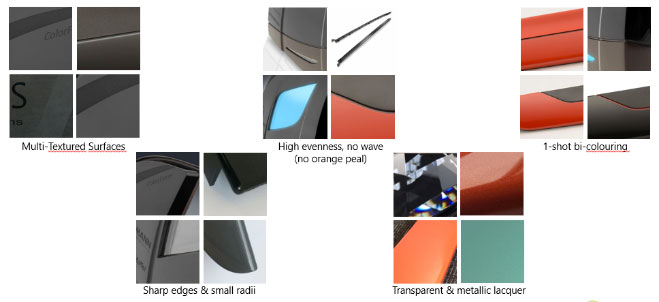 使用ColorFuse-In-Mold-Coating具有高均匀度和自愈性能的多纹理表面,1-shot-bicolor,锋利的边缘,小半径,透明和金属漆是可行的。