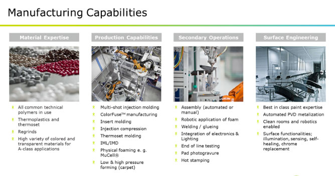 Techniplas:我们的主要技术是多组分和注塑成型、低压和高压成型、直接涂覆“ColorFuse”、涂装和涂层、PVD(物理气相沉积)、轻量化、物理发泡/MuCell、集成智能表面和箔的背面注射。