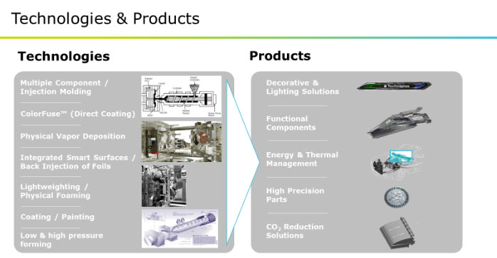 Techniplas:我们的主要产品和应用包括装饰和照明解决方案、功能组件、能源和热管理、高精度零件和二氧化碳减排解决方案。