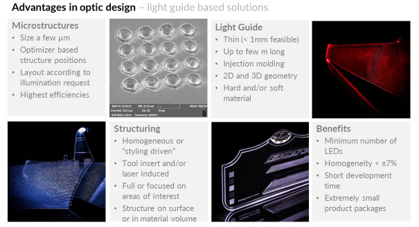 Techniplas 凭借其强大的光模拟程序“Optiback”计算自动微观结构优化和高光效率,从而减少 LED 的数量。通过几乎看不见的结构、按需的光模式,甚至在带有结构激光的光导体积中,激活具有非常扁平封装的光导成为可能。