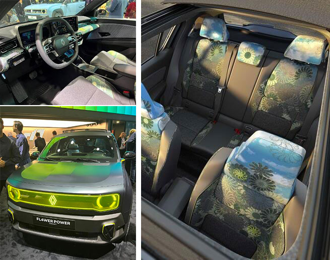 雷诺 FL4WER Power Concept 继承了新款 R4 的各个方面,但仍有一些特别的细节,例如经过黄色处理的格栅、带有黄色嵌件的重新设计的保险杠、黑色和车身颜色的新钢轮辋、配备全地形轮胎或几乎倾向于午夜蓝色的哑光深灰色调。雷诺表示与传统电动 R15 相比,离地间隙提高了 4 毫米。内部,可以看到一种新的 “flower power” 处理方式,座椅覆盖着蓝色花朵织物,该织物也沿着面向乘客的仪表板以及帆布车顶延伸。灵感来自雷诺所说的“超现实主义画家”。