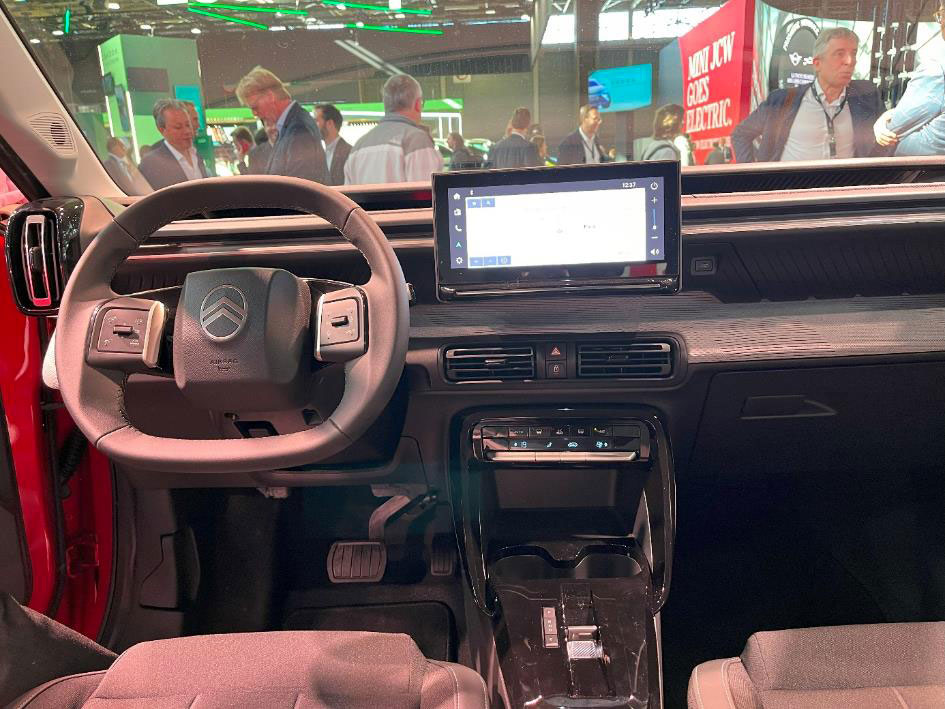 雪铁龙 ë-C3 作为第一款售价约为 20000 欧元的 Stellantis 电动汽车推出,这是在欧洲普及电动汽车所需的一个关键方向。它的小型平底方向盘顶部有一个数字仪表盘,看起来像标致的人体工程学。与之前的 C10 相比,驾驶位置提高了 3 厘米,显眼的引擎盖给人一种 SUV的既视感 。软垫既柔软又温馨,给用户舒适的体验和感受。