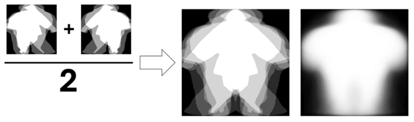 图像的重塑裁剪部分随后被叠加并取平均,从而生成行人对应边界框的姿态概率热图。为了使姿态概率 LID 对称,它会与自身的镜像叠加并取平均,从而有效地将用于 LID 的考虑姿态数量翻倍。在所有生成的矩阵被叠加后,得到的姿态概率 LID 类似于模糊的人形或白雪天使。