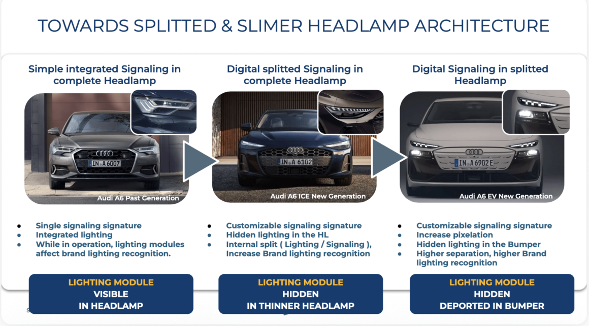 法雷奥主要管理人员,包括Klaus Matauschek(照明系统研发总监)、Pierre-Emanuel Strohl(灯光部门研发与战略总监)和Olivia Da Silva(照明系统营销总监)等,进行了精彩的演讲,并带领参观了新技术的室内演示。以奥迪A6为例,展示了前灯模块的进展情况。