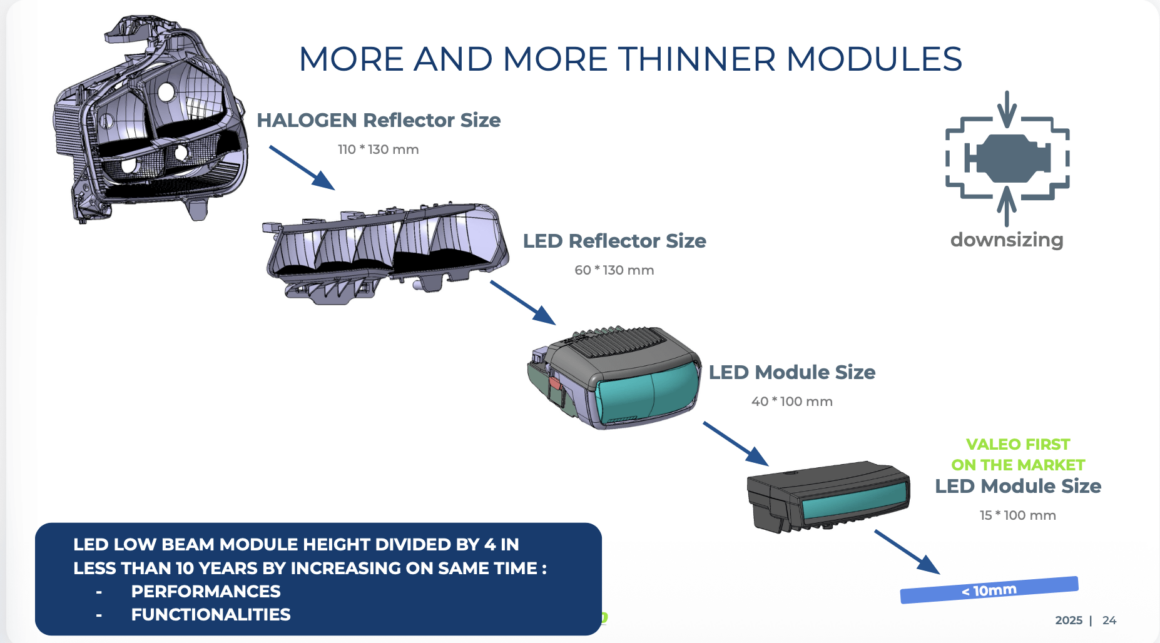 整车厂设计工作室对于大灯设计的一般趋势是向更纤薄的大灯发展。法雷奥通过提供高性能且效率可接受的纤薄模块,适应了这一趋势。几年前,高/低光和自适应远近光(ADB)大灯高度低于 10 毫米是无法实现的。