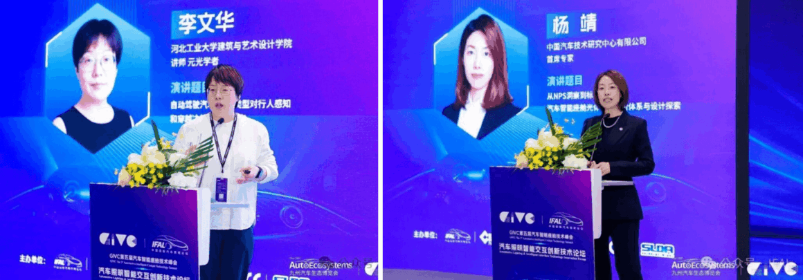 聚焦内部交互挑战,上汽大众智能驾驶系统开发经理曲亮直面“接管悖论”与“认知负荷”痛点,提出基于人因工程的“黄金三角”原则(安全第一、信任建立、无感交互)。他特别强调照明作为非侵入式模态,在通过光语传递系统状态、降低驾驶员认知负荷及校准人机信任方面,具有不可替代的核心价值。深耕外部交互实证,河北工业大学李文华博士针对自动驾驶eHMI场景,通过研究证实“图标类信号结合自适应闪烁策略”能显著降低行人认知负荷并优化过街决策,为外部光交互设计提供了坚实的科学依据。致力体验量化闭环,中国汽车技术研究中心有限公司首席专家杨靖主张打通从“NPS用户洞察”到“标准引领”的路径。她提出将主观光环境感受转化为客观评价指标,以反哺设计并推动行业标准制定,旨在破解“参数达标但体验不佳”的困境,确保光体验既合规又具高级感。