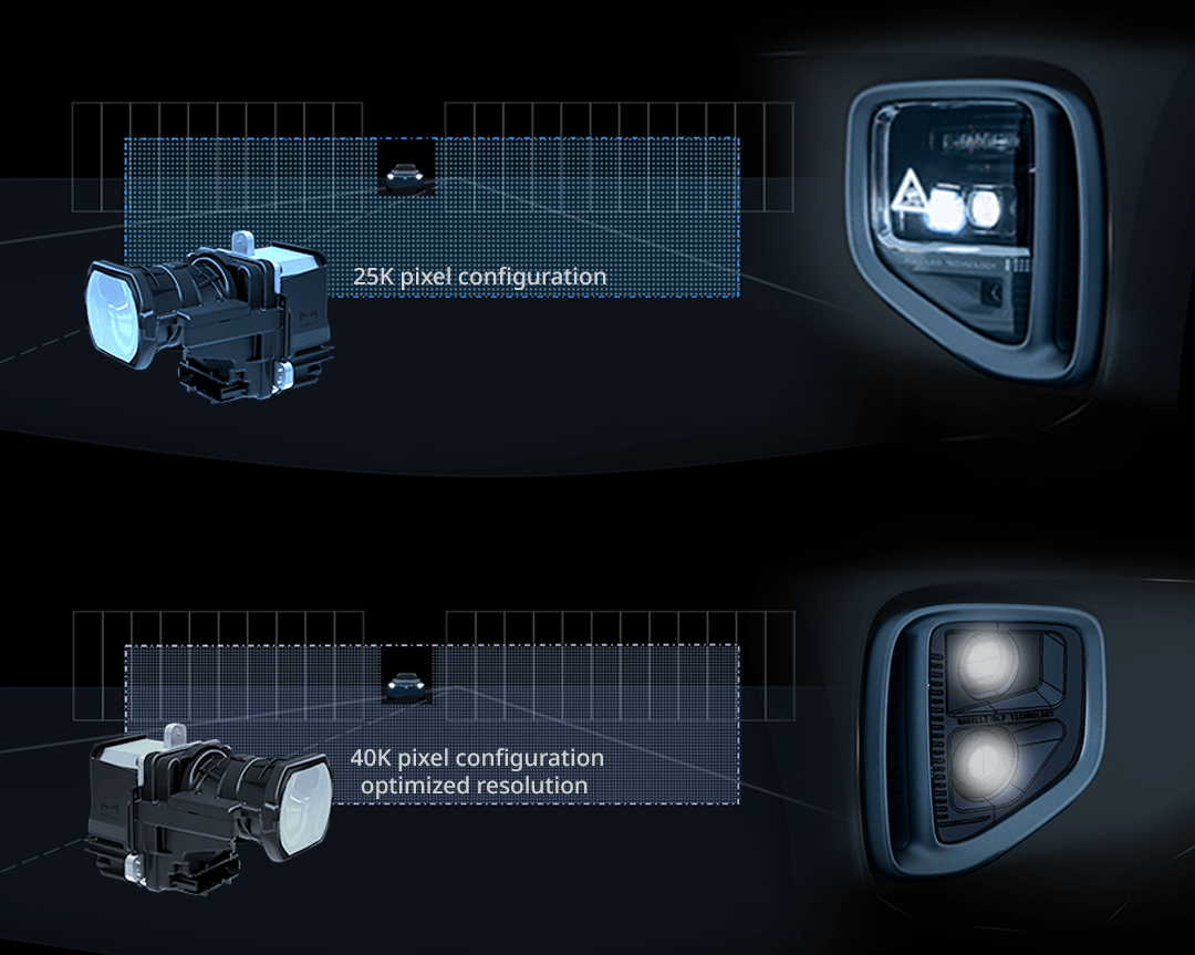 马瑞利 h‑Digi® MicroLED 是面向智能前照灯系统的高分辨率MicroLED 投影模组,提供 2.5 万像素与 4 万像素两种配置。2.5 万像素版本为成熟、紧凑且节能的方案,支持高精度自适应远光(ADB)、自适应前照灯、路面投影及动态灯光动画功能。4 万像素版本将在本届北京车展首发,并于现场开启报价,其像素密度与投射精度均得到进一步提升。