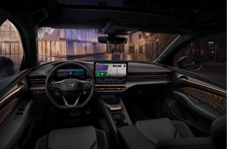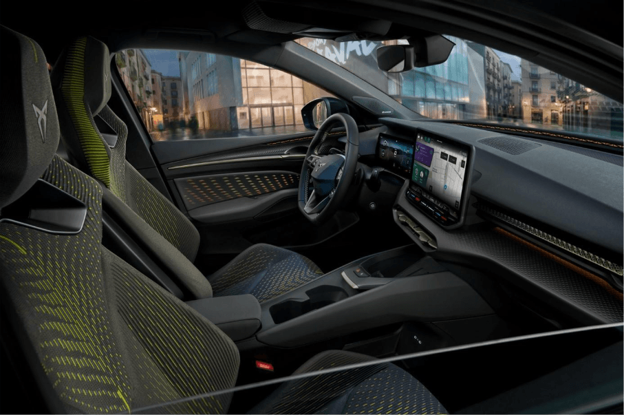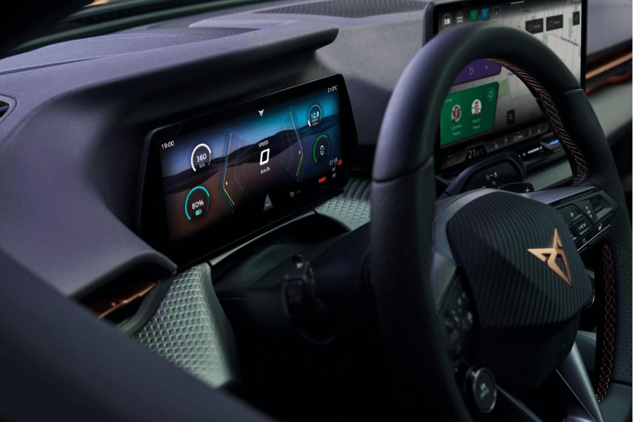 座舱整体营造出极具运动感与清新感的第一印象。车内配备两块立式平直屏幕,一块为驾驶员信息屏(DIM),另一块为尺寸更大的信息娱乐屏。驾驶员信息屏采用近乎 “复古式” 的内嵌布局,顶部配有遮光罩,既能优雅地框定显示信息,又大幅提升了仪表板上沿的视觉张力,凸显 Cupra以驾驶员为中心的设计理念 —— 处理十分精妙!