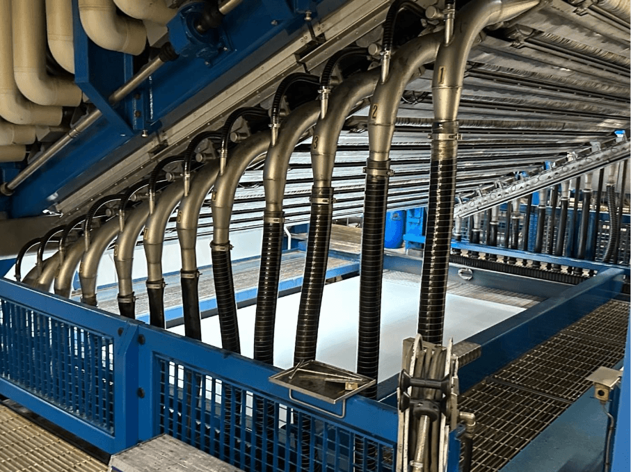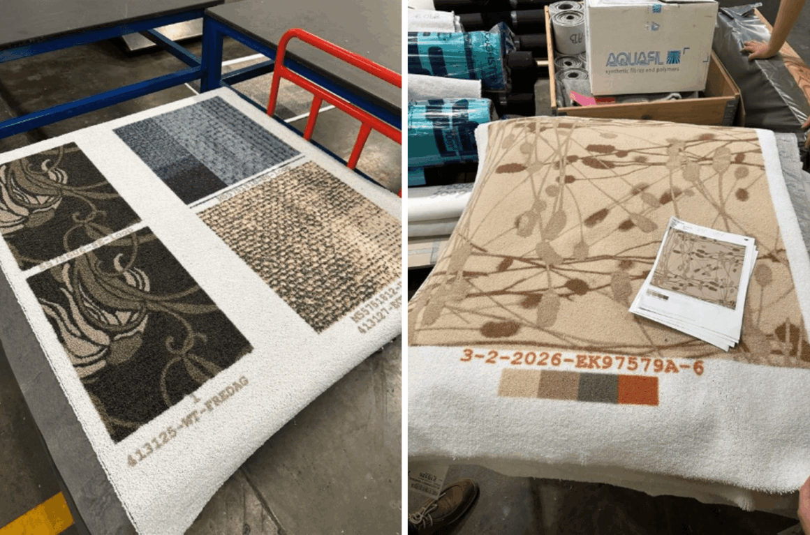 我们还参观了他们的高压喷射染色机——也就是业内所称的“印花机”。每笔订单的程序均为独立定制,因此基本可实现按需染色生产。设备每分钟可处理9–12米长的地毯。