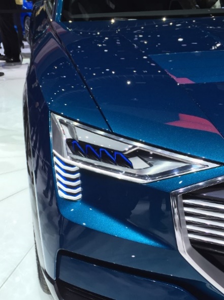 Audi’s e-tron quattro concept with matrix laser technology for the primary front lighting functions and a distinctive visual signature comprising 5 combination LED/OLED elements—a preview, perhaps, of future Matrix OLED technology. The rear lamps feature nine red OLED units for the rear position (tail) function: