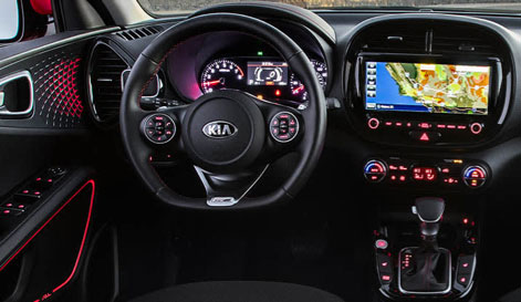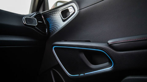 up at the same time as a stripe all around the lower part of the door panel. The music played in the car is visualized on the panel doors; Kia calls it their Sound Mood Ambient System.