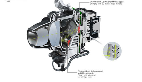Audi’s DMD headlamps are based on a small chip containing a million micromirrors, each of which measures just a few tens of micrometres on an edge. With the help of electrostatic fields, each individual micromirror can be tilted up to 5,000 times per second. Depending on the setting, the LED light is either directed via the lenses onto the road or is absorbed within the headlamp, to mask out areas of the light beam.
