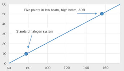 Last month we presented a new rating system which—for the first time—facilitates qualitative evaluation of glare-free high beam (ADB) systems. Now we bring you more information. TU-Darmstadt’s Professor Khanh, leader of the project to develop the rating system, says “The main point of this new rating system is to keep the principle of CIE TC 4-45 and to expand the evaluation to the ADB context based on weighting the use frequency of ADB. This new rating system has been validated with 17 different headlamps types. Before the VISION congress where the rating system will be presented, a number of automakers and setmakers will hold task force meetings in Darmstadt to optimise the evaluation by collecting headlamp luminous intensity curves, and to validate this evaluation by real test drives in August-September.”