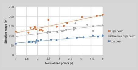The method based on laboratory measurements thus leads to representative results that enable a direct and objective comparison of different headlamp systems. The method presented is based on the recognised evaluation principles from the CIE standard TC 4-45 and the legal requirements according to UN R123.