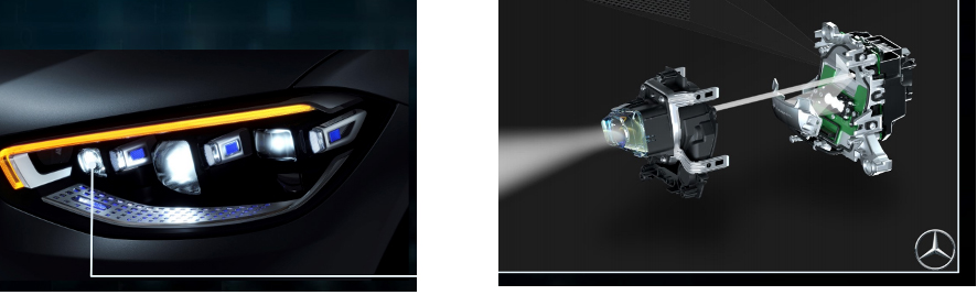 Mercedes’ “Digital Light” is made by the DMD module with three extremely powerful LEDs whose light is refracted and directed by 1.3 million micro-mirrors. It is a technology widely employed in video projectors.