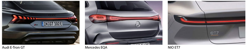 The Audi e-Tron GT, Mercedes EQA, Nio ET 7, and Nissan Arima are among the increasing number of models with rear light bands spanning the whole width. This brings new possibilities for vehicle design and style, animated light effects, and augments the vehicle’s perceived size and presence, while also providing lit area that would otherwise be missing due to the next trend, № 3.