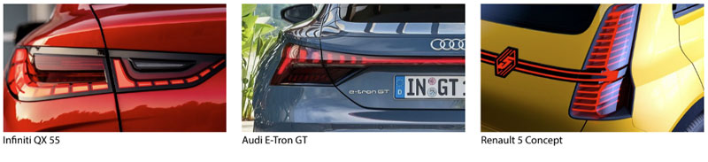 The Infiniti QX55 with its “digital piano-keys” taillights, Audi’s e-tron GT, and the Renault 5 Concept are a few of many examples. Very few vehicles have OLED rear lighting (yet?), but other technologies and techniques are also providing attractive new designs—we like the triangular “fish scales” effect on the DS4. Which technology will transform the rear lamps into rear end communication displays?