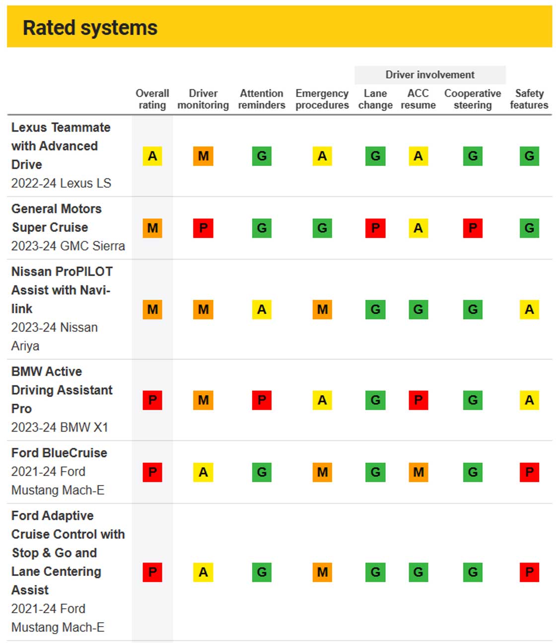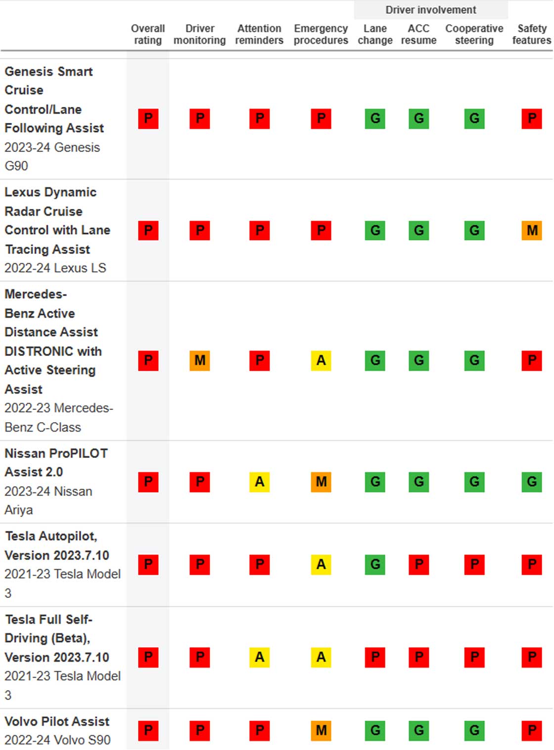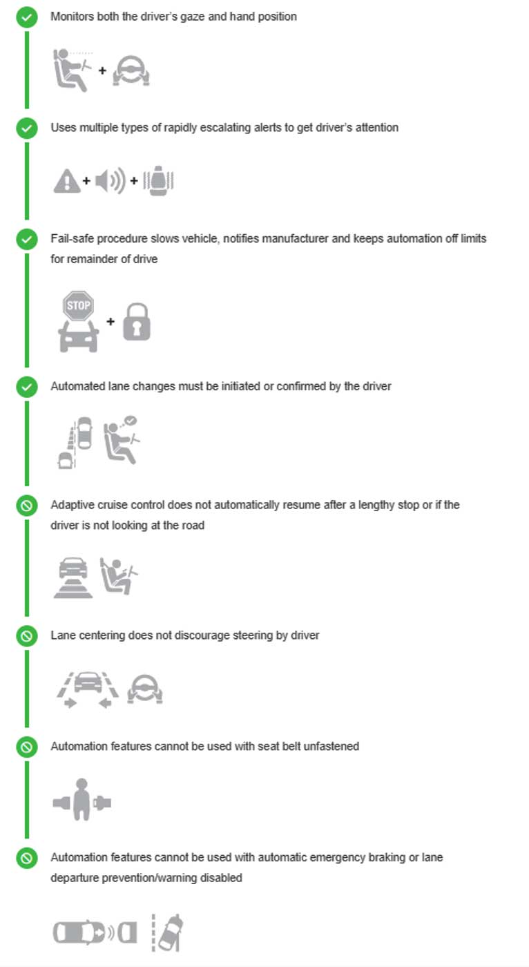 For our partial automation safeguard ratings, we evaluate driver monitoring, attention reminders, emergency procedures and other aspects of system design. A system may be assigned a rating of good, acceptable, marginal or poor for its safeguards.