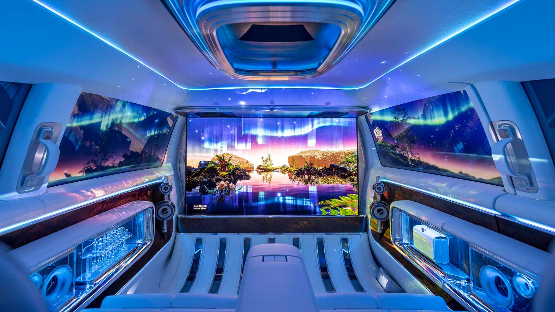 Seven projectors integrated into the roof liner and floor expand the visual field, while the side windows function as additional projection surfaces, to create a dynamic 360° digital experience that is further enhanced by ambient lighting that adjusts to the rhythm of the music.