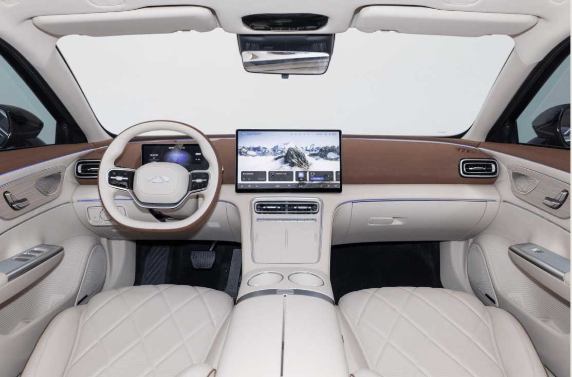 The cabin features an AR-HUD from Huawei, a 15.6-inch OLED central touchscreen, and a 21.3-inch ceiling-mounted 3K screen for rear passengers. The front and second-row seats offer heating, ventilation, and eight-point massage functions. There’s a 10-liter refrigerated storage compartment and a movable center tunnel for enhanced passenger comfort.