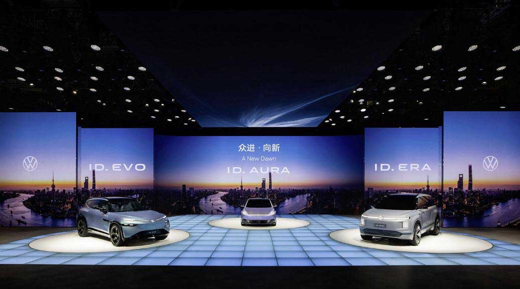 Volkswagen showed (from left) the concept vehicles ID.EVO (with Anhui), ID.AURA (with FAW) and ID.ERA (with SAIC).