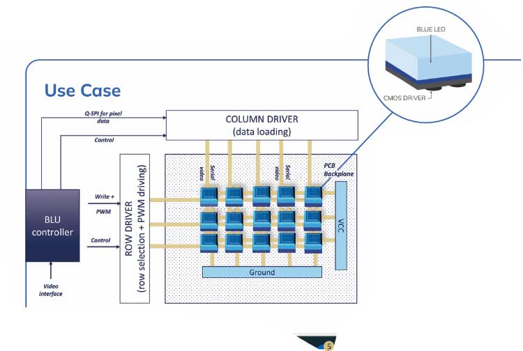 - Blue Digital LED (ALD-SP-0004) for high-performance display applications like virtual reality, automotive central information displays, HUDs, televisions, notebooks, gaming and professional monitors. These are a 2-in-1 component with the blue-emitting LED integrated with CMOS driving electronics equipped with on-chip 16-bit data memory and PWM current driving capability, and on-chip compensation for non-uniformity, and with a peak luminous intensity of 50 mcd per chip at 25 °C, allowing also reduced power consumption.