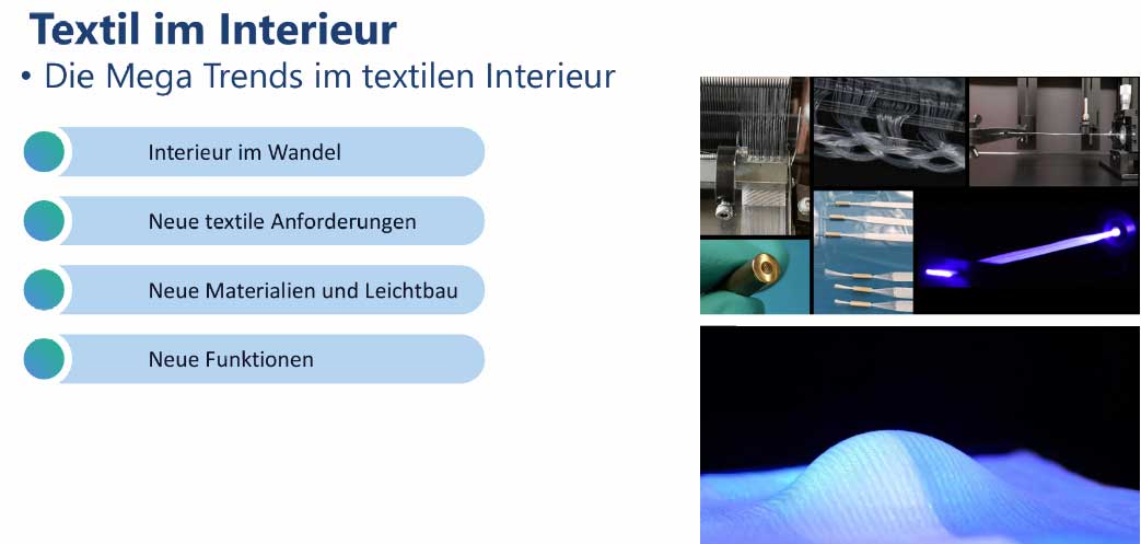 Especially in these challenging times, sharp focus on future-oriented developments is crucial. The vehicle interior is increasingly becoming a differentiating factor; it represents comfort, design and digitalization and shapes the driving experience of the future. Innovations in materials, technologies and sustainable concepts can provide new impetus and open market potential. But which trends, technologies and markets do we need to understand today to be successful tomorrow? What requirements of different markets need to be considered to ensure long-term competitiveness?