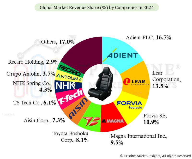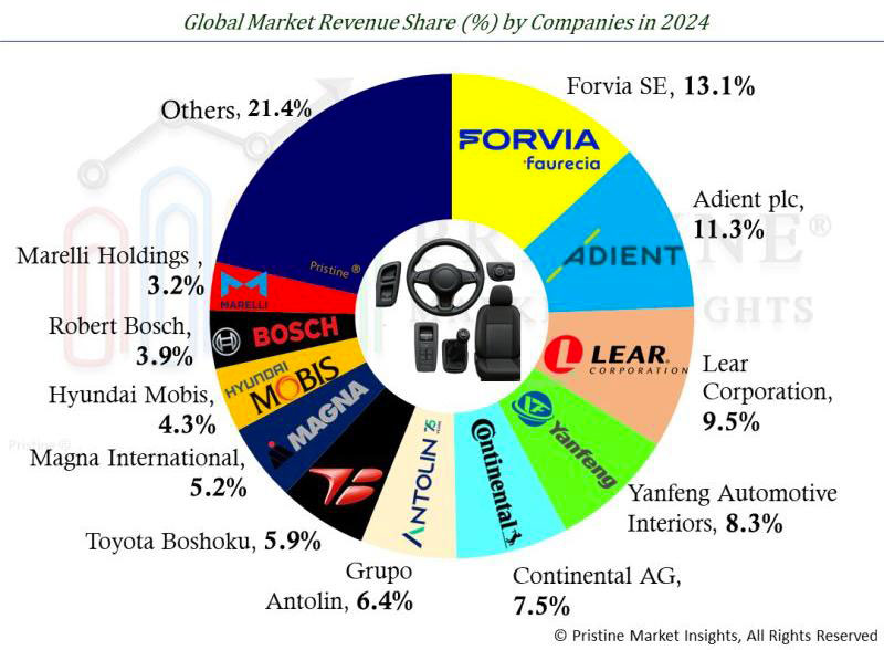 Pristine Market Insights has published this market share chart. The three biggest seat suppliers are Lear, Adient, and Forvia, and seats are a major chunk of the interior business, with a market much more concentrated than the rest of the interior. And, within seats surface materials represent a high percentage, mainly because of leather costs.