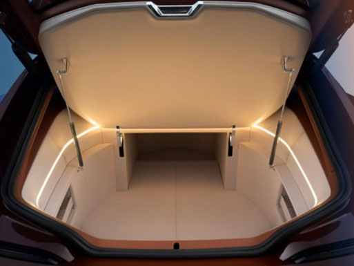 The roof bar acts as a light joint in the two-tone leather-covered headlining. The leather-covered and illuminated trunk features Budapest-style perforations.