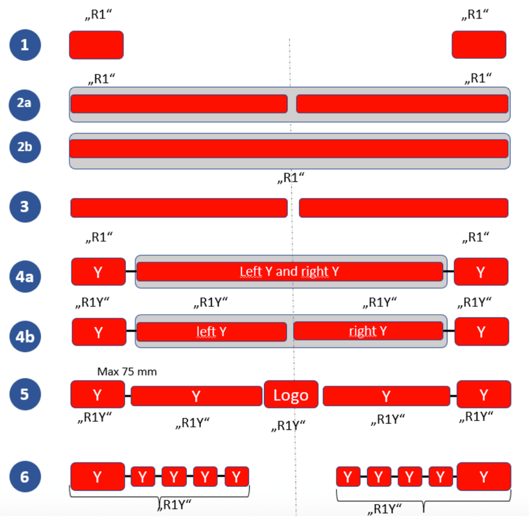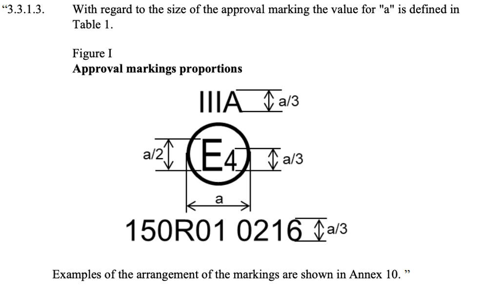 | 2026/10, GRE-94-07 | R148 S1 | Proposed by GTB: Clarification of grouped markings and labels. “4.1. For the additional approval markings specific to the device, labels may be used. Such labels shall be durable for the useful life of the device. Labels shall be clearly legible and their letters and figures shall be indelible. Additionally, labels shall be attached in such a manner that their fixing is durable for the useful life of the device, and the labels cannot be removed without destroying or defacing them.” | Similar proposal for UNECE R149 S1 (Light Signaling device is included in the proposal. Examples are shown and explained in the informal document 94-07. The use of labels for displaying the approval mark is already permitted in R10 (EMC), 45 (HL cleaners) and R132 (Retrofit Emission Control devices (REC)). |