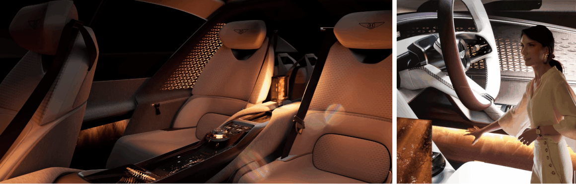 “Luxury is timeless, so we are inspired by things that are timelessly beautiful to humans”, explains Naomi Saka, Lead Lighting Designer. She is inspired by moments like sunlight dancing on the ocean, and the way light filters through leaves, interacting with materials. Bentley’s Nature Inspired Lighting, refracted through an optical lens in front of the LEDs, constantly subtly moves and changes with the environment.
