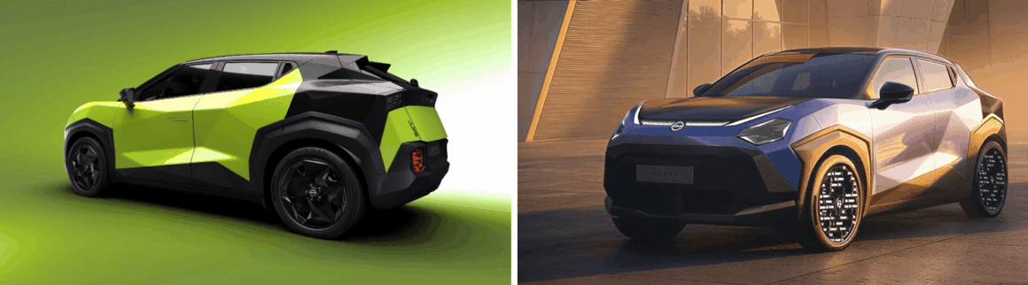 The Juke has a front lit logo and a light band in lower part of the hood. The functional lamps have a complex hexagonal shape, never seen quite like this in a production car – though perhaps there was some small seed of inspiration for them in the hexagonal front and rear light treatment on Nissan’s 1974-’78 Cherry F-II (“Datsun F-10” in North America). The new Juke’s lower rear lamps recall the Kia EV2.